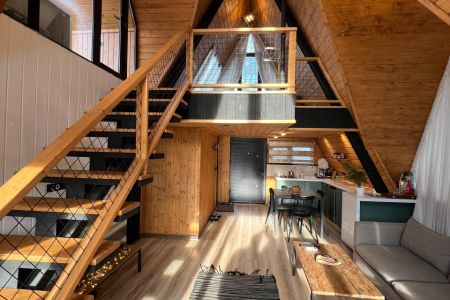 یتمیز تصمیم هذا الکوخ بغرفه معیشه، ومطبخ، وغرفه نوم، وحمام مع مرحاض غربی فی الطابق السفلی، وغرفه نوم اخری مع شرفه واسعه فی الطابق العلوی.