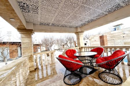 تقع هذه الفيلا المكونة من غرفة نوم واحدة مع مسبح خارجي وعريشة ومدفأة وفناء مفتوح في بيئة آمنة في بلدة بهاران ، على بعد حوالي 5 كم من شهریار.