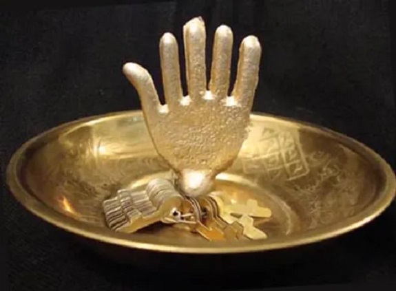 در گذشته این جام را به حمام میبردند تا از حضور اجنه جلوگیری کند و حتی برای مراسم چله بریدن نوزاد نیز کاربرد داشته است. دست وسط جام که بعدها به آن اضافه شد، نشان از دعا و طلب حاجت دارد.