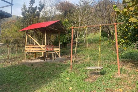 وجود سازه ی چوبی مسقف به همراه تاب در حیاط دلباز این کلبه، فضایی جذاب و دلنشین را جهت شب نشینی و دورهمی مهمانان فراهم نموده است.