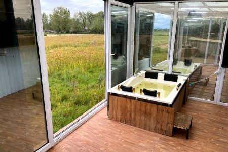 وان جکوزی در محوطه پشت ویلا و در یک بالکن با دیوار شیشه ای قرار گرفته که از اتاق خواب نیز قابل دسترسی می باشد.