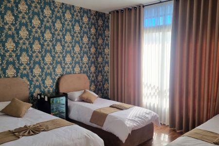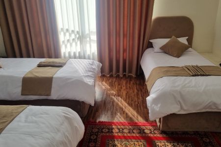 2 تخت یکنفره و 1 تخت دونفره در فضای مشترک